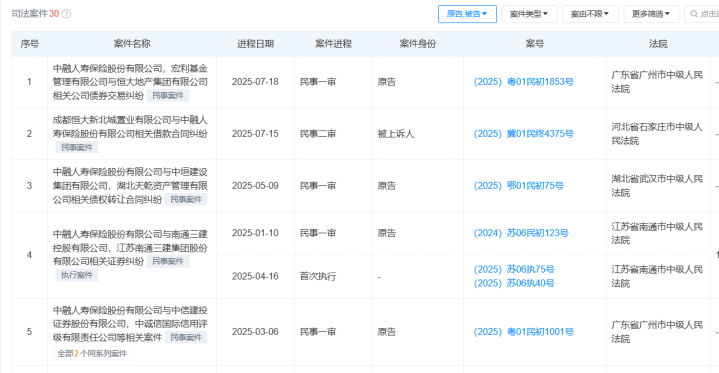 近日,通过天眼查诉讼信息发现,中融人寿保险股份有限公司(以下简称“中融人寿”)2025年以被告陷入5起纠纷案件,案由主要是公司债权交易纠纷、借款合同纠纷、债权转让合同纠纷、证券纠纷,案件遍及广东、江苏、湖北、河北。